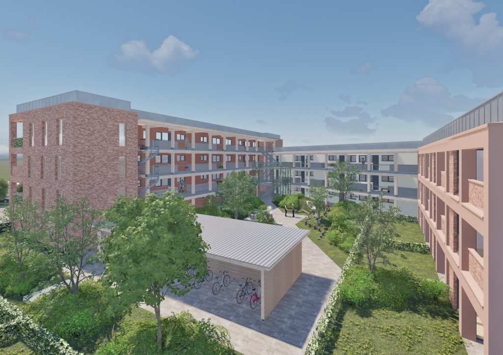 Eine Tiefgarage und ein Fahrradpavillon entlasten die Quartiersflächen; über eine Außenrampe gelangen Bewohnerinnen und Bewohner mit dem Fahrrad direkt auf die Wohnebene im 1. OG. Die künftige Erschließung bindet das Gebiet an die Stadtbuslinie an.