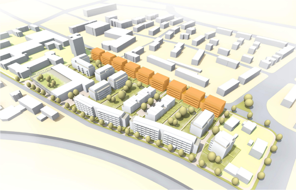 Quartiersbebauung in Bad Homburg mit 6 verschiedenen Haustypen, Nahversorger und KiTa. Insgesamt sind ca. 285 Wohneinheiten auf dem gesamten Areal geplant. Auf dem Dach des Vollsortimenters am westlichen Rand des Quartiers entsteht eine KiTa. Auf der Freifläche östlich von diesem Hybridbau wird ein zentraler Quartiersplatz mit öffentlichem Charakter geschaffen.